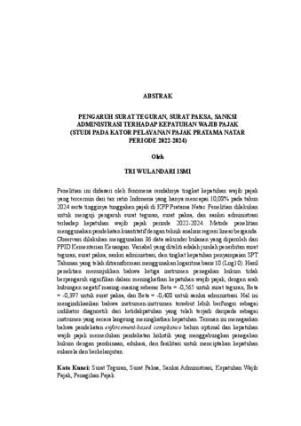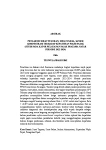 Penelitian ini didasari oleh fenomena rendahnya tingkat kepatuhan wajib pajak yang tercermin dari tax ratio Indonesia yang hanya mencapai 10,08% pada tahun 2024 serta tingginya tunggakan pajak di KPP Pratama Natar. Penelitian dilakukan untuk menguji pengaruh surat teguran, surat paksa, dan sanksi administrasi terhadap kepatuhan wajib pajak periode 2022-2024. Metode penelitian menggunakan pendekatan kuantitatif dengan teknik analisis regresi linear berganda. Observasi dilakukan menggunakan 36 data sekunder bulanan yang diperoleh dari PPID Kementerian Keuangan. Variabel yang diteliti adalah jumlah penerbitan surat teguran, surat paksa, sanksi administrasi, dan tingkat kepatuhan penyampaian SPT Tahunan yang telah ditransformasi menggunakan logaritma basis 10 (Log10). Hasil penelitian menunjukkan bahwa ketiga instrumen penegakan hukum tidak berpengaruh signifikan dalam meningkatkan kepatuhan wajib pajak, dengan arah hubungan negatif masing-masing sebesar Beta = -0,565 untuk surat teguran, Beta = -0,397 untuk surat paksa, dan Beta = -0,408 untuk sanksi administrasi. Hal ini mengindikasikan bahwa instrumen-instrumen tersebut lebih berfungsi sebagai indikator diagnostik dari ketidakpatuhan yang telah terjadi daripada sebagai instrumen yang secara langsung meningkatkan kepatuhan. Temuan ini menegaskan bahwa pendekatan enforcement-based compliance belum optimal dan kepatuhan wajib pajak memerlukan pendekatan holistik yang menggabungkan penegakan hukum dengan pembinaan, edukasi, dan fasilitasi untuk menciptakan kepatuhan sukarela dan berkelanjutan. Kata Kunci: Surat Teguran, Surat Paksa, Sanksi Administrasi, Kepatuhan Wajib Pajak, Penagihan Pajak.