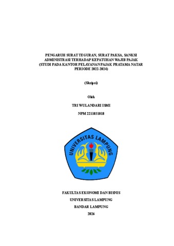 Tri Wulandari, Ismi (2026) PENGARUH SURAT TEGURAN, SURAT PAKSA, SANKSI ADMINISTRASI TERHADAP KEPATUHAN WAJIB PAJAK (STUDI PADA KANTOR PELAYANAN PAJAK PRATAMA NATAR PERIODE 2022-2024). FAKULTAS EKONOMI DAN BISNIS, UNIVERSITAS LAMPUNG.