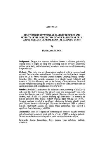 Denisa, Maharani (2025) HUBUNGAN PROFIL LABORATORIUM TERHADAP DERAJAT KEPARAHAN PASIEN DEMAM BERDARAH DENGUE ANAK DI RSUD DR. H. ABDUL MOELOEK LAMPUNG TAHUN 2024. FAKULTAS KEDOKTERAN, UNIVERSITAS LAMPUNG .