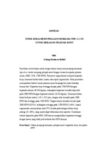Penelitian ini bertujuan untuk mengevaluasi kinerja alat perajang biomassa tipe slicer untuk merajang pelepah sawit dengan variasi kecepatan putaran mesin (2000, 2350, 2700 RPM). Parameter yang diamati meliputi kapasitas kerja, konsumsi bahan bakar, losses, dan aspek ergonomika. Hasil penelitian menunjukkan bahwa variasi putaran mesin berpengaruh nyata terhadap kinerja alat. Kapasitas kerja tertinggi dicapai pada 2700 RPM dengan kapasitas sebesar 465,96 kg/jam, sedangkan kapasitas terendah diperoleh pada 2000 RPM dengan kapasitas sebesar 185,04 kg/jam. Konsumsi bahan bakar berkisar antara 1,29–1,70 L/jam, dengan nilai terendah pada 2000 RPM dan tertinggi pada 2700 RPM. Tingkat losses terendah tercatat pada 2000 RPM (0,95%), sedangkan tertinggi pada 2700 RPM (2,44%). Aspek ergonomika menunjukkan nilai CVL berada pada kategori beban kerja sedang (31–36%), yang masih dapat ditoleransi oleh operator. Kombinasi terbaik diperoleh pada RPM 2700 karena menghasilkan kapasitas tertinggi dengan losses yang tidak jauh berbeda dari RPM lainnya. Kata kunci : Mesin perajang biomassa, pelepah sawit, kapasitas kerja, kecepatan putar