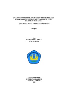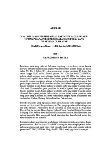 NAJWA , DEISYA MAYLA (2026) ANALISIS DASAR PERTIMBANGAN HAKIM TERHADAP PELAKU TINDAK PIDANA PEREDARAN MATA UANG PALSU YANG DILAKUKAN OLEH ANAK (Studi Putusan Nomor : 1/Pid.Sus-Anak/2024/PN.Kot). FAKULTAS HUKUM , UNIVERSITAS LAMPUNG.