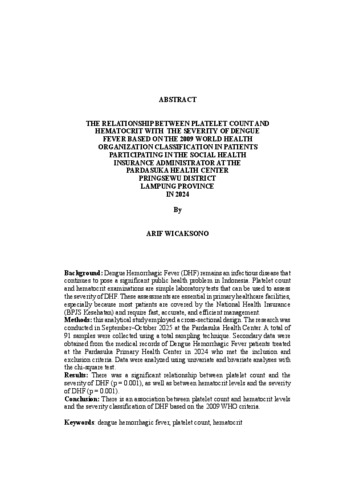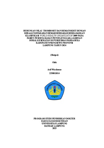 ARIF, WICAKSONO (2025) HUBUNGAN NILAI TROMBOSIT DAN HEMATOKRIT DENGAN DERAJAT KEPARAHAN DEMAM BERDARAH BERDASARKAN KLASIFIKASI WORLD HEALTH ORGANIZATION 2009 PADA PASIEN PESERTA BADAN PENYELENGGARA JAMINAN SOSIAL KESEHATAN DI PUSKESMAS PARDASUKA KABUPATEN PRINGSEWU PROVINSI LAMPUNG TAHUN 2024. FAKULTAS KEDOKTERAN, UNIVERSITAS LAMPUNG.