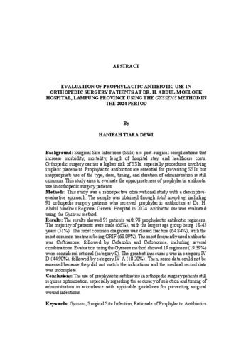 TIARA DEWI, HANIFAH (2026) EVALUASI PENGGUNAAN ANTIBIOTIK PROFILAKSIS PADA PASIENBEDAH ORTOPEDI DI RSUD DR. H. ABDUL MOELOEK PROVINSI LAMPUNG MENGGUNAKAN METODE GYSSENS PERIODE 2024. FAKULTAS KEDOKTERAN, UNIVERSITAS LAMPUNG.