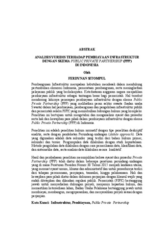 FERDYNAN , SITOMPUL (2026) ANALISIS YURIDIS TERHADAP PEMBIAYAAN INFRASTRUKTUR DENGAN SKEMA PUBLIC PRIVATE PARTNERSHIP (PPP) DI INDONESIA. FAKULTAS HUKUM , UNIVERSITAS LAMPUNG.