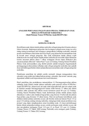 Keterlibatan anak dalam tindak pidana narkotika sebagai pengedar di karena adanya faktor ekonomi, lingkungan pergaulan dan kurangnya pengawasan orang tua serta iming-iming keuntungan dan kurangnya pengetahuan terhadap narkotika menjadi pemicu keterlibatan anak dalam aktivitas ilegal yang dalam hal ini menjadikan anak di bawah umur sebagai pengedar. Jika anak melakukan tindak pidana wajib dilakukan diversi tetapi dalam tindak pidana narkotika diversi tidak dapat dilakukan karena ancaman pidana diatas 7 tahun sedangkan diversi dapat dilakukan jika ancaman pidana dibawah 7 tahun Pasal 7 ayat (2) Undang-Undang Sistem Peradilan Pidana Anak permasalahan yang diteliti penulis adalah mengenai bagaimanakah pertanggungjawaban pidana terhadap anak sebagai pengedar narkotika dan apakah dasar pertimbangan hakim dalam penjatuhan putusan pidana anak sebagai pengedar narkotika. Pendekatan penelitian ini adalah yuridis normatif, dengan menggunakan data sekunder yang terdiri dari bahan hukum primer, sekunder, dan tersier. metode yang digunakan adalah studi kepustakaan dan studi dokumen. Hasil penelitian dan pembahasan menunjukkan (1) Pertanggungjawaban pidana terhadap Anak Pelaku tindak pidana narkotika pada putusan nomor 87/Pid.Sus- Anak/2023/PN.Tjk. dalam kasus ini anak telah terpenuhi baik dari sisi subjek anak di katakan mampu bertanggungjawab karena telah berusia 17 tahun dan dalam keadaan sehat jasmani dan rohani sesuai ketentuan pasal 69 ayat (2) Undang- Undang Sistem Peradilan Pidana Anak disebutkaan pelaku tindak pidana dapat dikenakan 2 sanksi yaitu tindakan bagi pelaku yang berusia 14 kebawah dan pidana bagi pelaku yang berumur 15 tahun keatas. Dari sisi perbuatan keterlibatan anak didalam tindak pidana narkotika secara sah bersifat melawan hukum Pasal 114 jo pasal 132 undang-undang tentang narkotika. mengingat tidak alasan pembenar atau pemaaf yang dapat menghapuskan unsur kesalahan anak. (2) dasar pertimbangan hakim dalam penjatuhan pidana secara yuridis perbuatan anak terbukti secara sah dan meyakinkan melanggar Pasal 114 ayat (1) jo Pasal 132 ayat (1) UndangUndang Nomor 35 Tahun 2009 tentang Narkotika serta mengacu pada UndangUndang Nomor 11 Tahun 2012 tentang. Sistem peradilan Pidana Anak. yang mana ancaman pidana maksimal 20 tahun penjara, secara filosofis sanksi pidana penjara di LPKA bukan sekedar pembalasan melainkan sebagai pembinaan dan secara sosiologis hakim mempertimbangkan faktor lingkungan yang memicu keterlibatan anak dalam jaringan narkotika. Saran (1) Orang tua memegang peran utama dalam mengarahkan masa depan anak, sehingga pengawasan yang lebih ketat diperlukan untuk menghindarkan mereka dari pengaruh negatif seperti narkotika. namun tanggungjawab ini tidak hanya bertumpu pada keluarga, pemerintah, masyarakat, dan penegak hukum juga saling bahu membahu. melalui kerja sama yang solid dalam memberikan edukasi hukum serta pembinaan kerohanian diharapkan lingkungan yang sehat bagi anak dapat tercipta sehingga meminimalisir peluang anak melakukan tindak pidana. (2) hakim diharapkan tidak hanya memikirkan dari segi normatifnya saja dalam memutus perkara tetapi harus mempertimbangkan dampak jangka panjang dari vonis tersebut terhadap masa depan anak The involvement of children in narcotics crimes as dealers is due to economic factors, social environment and lack of parental supervision as well as the lure of profits and lack of knowledge about narcotics which triggers the involvement of children in illegal activities which in this case makes minors become dealers. If a child commits a crime, diversion is mandatory but in narcotics crimes, diversion cannot be done because the criminal threat is above 7 years, while diversion can be done if the criminal threat is below 7 years. Article 7 paragraph (2) of the Child Criminal Justice System Law. The problem studied by the author is regarding how criminal responsibility is imposed on children as narcotics dealers and what is the basis for the judge's consideration in imposing criminal decisions on children as narcotics dealers. This research approach is normative juridical, using secondary data consisting of primary, secondary, and tertiary legal materials. The methods used are library research and document study. The results of the research and discussion show (1) Criminal responsibility for children who commit narcotics crimes in decision number 87/Pid.SusAnak/2023/PN.Tjk. in this case the child has been fulfilled both from the subject's side, the child is said to be able to be responsible because he is 17 years old and is in a healthy physical and mental condition according to the provisions of Article 69 paragraph (2) of the Child Criminal Justice System Law, it is stated that perpetrators of criminal acts can be subject to 2 sanctions, namely actions for perpetrators aged 14 and under and criminal for perpetrators aged 15 and over. From the side of the act of involving children in narcotics crimes legally, it is against the law Article 114 in conjunction with Article 132 of the law on narcotics. considering that there is no justification or excuse that can eliminate the element of the child's guilt. (2) The basis for the judge's consideration in imposing a legal sentence is that the child's actions have been legally and convincingly proven to violate Article 114 paragraph (1) in conjunction with Article 132 paragraph (1) of Law Number 35 of 2009 concerning Narcotics and refers to Law Number 11 of 2012 concerning The Juvenile Criminal Justice System, which carries a maximum penalty of 20 years in prison, philosophically provides a prison sentence not merely for retribution but also as a form of guidance. From a sociological perspective, judges consider environmental factors that trigger children's involvement in drug networks. Suggestions (1) Parents play a primary role in guiding their children's future, so stricter supervision is needed to protect them from negative influences such as narcotics. However, this responsibility does n
