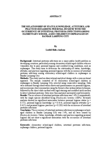 Infeksi protozoa usus menjadi masalah utama kesehatan masyarakat di negara berkembang, khususnya pada anak usia sekolah dasar yang rentan karena faktor personal hygiene yang masih kurang baik dan kondisi lingkungan tempat tinggal yang padat seperti panti asuhan. Penelitian ini bertujuan untuk mengetahui hubungan status, pengetahuan, sikap, dan perilaku tentang personal hygiene dengan kejadian infeksi protozoa usus pada anak usia sekolah dasar di panti asuhan Kota Bandar Lampung. Penelitian ini menggunakan desain observasional analitik dengan pendekatan cross-sectional. Sampel penelitian adalah 56 anak usia sekolah dasar di panti asuhan Kota Bandar Lampung yang dipilih menggunakan teknik consecutive sampling. Data diperoleh melalui pengisian lembar observasi dan kuesioner tentang personal hygiene dan pemeriksaan feses secara mikroskopis menggunakan teknik sedimentasi formol-eter dilanjutkan dengan metode direct slide menggunakan pewarnaan lugol serta modifikasi ziehl-neelsen untuk mendeteksi protozoa usus. Kemudian data dianalisis secara univariat dan bivariat. Kejadian infeksi protozoa usus sebesar 5,4% (3 responden), dengan spesies tunggal yang teridentifikasi adalah Blastocystis hominis (100%). Analisis bivariat menunjukkan tidak terdapat hubungan yang signifikan antara status personal hygiene (p = 0,551), pengetahuan personal hygiene (p = 0,414), sikap personal hygiene (p = 0,415), dan perilaku personal hygiene (p = 0,203) dengan kejadian infeksi protozoa usus. Kejadian infeksi protozoa usus pada anak panti asuhan di Kota Bandar Lampung adalah 5,4% dan seluruhnya disebabkan oleh Blastocystis hominis. Status, pengetahuan, sikap, dan perilaku tentang personal hygiene tidak menunjukkan adanya hubungan yang signifikan terhadap kejadian infeksi protozoa usus. Kata Kunci: anak panti asuhan, anak usia sekolah dasar, infeksi protozoa usus, personal hygiene.