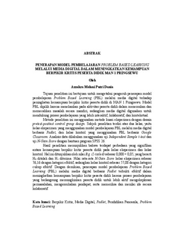 Tujuan penelitian ini bertujuan untuk mengetahui pengaruh penerapan model pembelajaran Problem Based Learning (PBL) melalui media digital terhadap peningkatan kemampuan berpikir kritis peserta didik di MAN 1 Pringsewu. Model PBL dipilih karena menekankan pada aktivitas peserta didik dalam menemukan dan memecahkan masalah secara mandiri, sedangkan media digital digunakan untuk mendukung proses pembelajaran yang lebih interaktif, kolaboratif, dan kontekstual. Metode penelitian ini menggunakan metode kuasi eksperimen dengan desain pretest-posttest control group design. Subjek penelitian terdiri atas dua kelas, yaitu kelas eksperimen yang menggunakan model pembelajaran PBL melalui media digital berbasis Padlet, dan kelas kontrol yang menggunakan PBL berbasis Google Classroom. Analisis data dilakukan menggunakan uji Independent Sample t-test dan uji N-Gain Score dengan bantuan program SPSS 26. Hasil penelitian menunjukkan bahwa terdapat perbedaan yang signifikan antara kemampuan berpikir kritis peserta didik pada kelas eksperimen dan kelas kontrol. Hal ini ditunjukkan oleh nilai Sig. (2-tailed) sebesar 0,000 < 0,05, yang berarti H₀ ditolak dan H₁ diterima. Nilai rata-rata N-Gain Score kelas eksperimen sebesar 76,16 dengan kategori efektif, sedangkan kelas kontrol sebesar 57,08 dengan kategori cukup efektif. Dengan demikian, penerapan model pembelajaran Problem Based Learning (PBL) melalui media digital berbasis Padlet terbukti efektif dalam meningkatkan kemampuan berpikir kritis peserta didik karena proses pembelajaran yang berlangsung memungkinkan peserta didik untuk lebih aktif mengeksplorasi permasalahan, mengemukakan pendapat, serta memeriksa dan menilai ide secara kolaboratif. Kata kunci: Berpikir Kritis, Media Digital, Padlet, Pendidikan Pancasila, Problem Based Learning