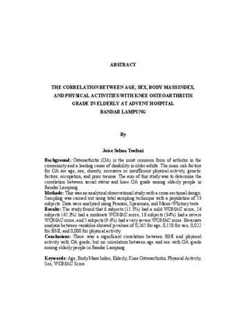 Selma Teofani, Joice (2026) HUBUNGAN USIA, JENIS KELAMIN, INDEKS MASA TUBUH, DAN AKTIVITAS FISIK TERHADAP GRADE OSTEOARTHRITIS LUTUT PADA LANSIA DI RUMAH SAKIT ADVENT BANDAR LAMPUNG. FAKULTAS KEDOKTERAN, UNIVERSITAS LAMPUNG.