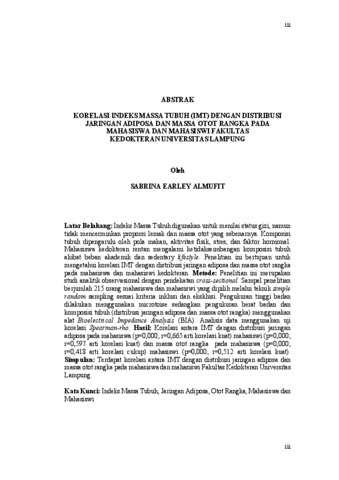 Sabrina Earley, Almufit (2025) KORELASI INDEKS MASSA TUBUH (IMT) DENGAN DISTRIBUSI JARINGAN ADIPOSA DAN MASSA OTOT RANGKA PADA MAHASISWA DAN MAHASISWI FAKULTAS KEDOKTERAN UNIVERSITAS LAMPUNG. FAKULTAS KEDOKTERAN, UNIVERSITAS LAMPUNG.