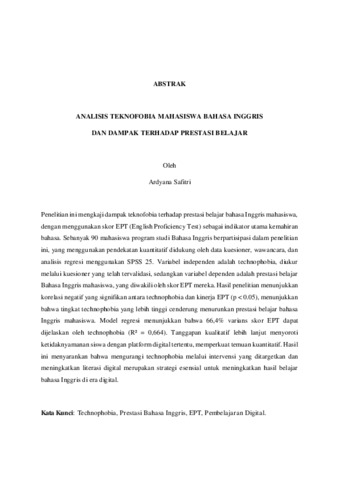 Penelitian ini mengkaji dampak teknofobia terhadap prestasi belajar bahasa Inggris mahasiswa, dengan menggunakan skor EPT (English Proficiency Test) sebagai indikator utama kemahiran bahasa. Sebanyak 90 mahasiswa program studi Bahasa Inggris berpartisipasi dalam penelitian ini, yang menggunakan pendekatan kuantitatif didukung oleh data kuesioner, wawancara, dan analisis regresi menggunakan SPSS 25. Variabel independen adalah technophobia, diukur melalui kuesioner yang telah tervalidasi, sedangkan variabel dependen adalah prestasi belajar Bahasa Inggris mahasiswa, yang diwakili oleh skor EPT mereka. Hasil penelitian menunjukkan korelasi negatif yang signifikan antara technophobia dan kinerja EPT (p < 0.05), menunjukkan bahwa tingkat technophobia yang lebih tinggi cenderung menurunkan prestasi belajar bahasa Inggris mahasiswa. Model regresi menunjukkan bahwa 66,4% varians skor EPT dapat dijelaskan oleh technophobia (R² = 0,664). Tanggapan kualitatif lebih lanjut menyoroti ketidaknyamanan siswa dengan platform digital tertentu, memperkuat temuan kuantitatif. Hasil ini menyarankan bahwa mengurangi technophobia melalui intervensi yang ditargetkan dan meningkatkan literasi digital merupakan strategi esensial untuk meningkatkan hasil belajar bahasa Inggris di era digital. Kata Kunci: Technophobia, Prestasi Bahasa Inggris, EPT, Pembelajaran Digital.