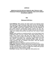 ABSTRAK HUBUNGAN STATUS GIZI DAN DURASI LAMA TINGGAL ANAK TERHADAP INFEKSI PROTOZOA USUS PADA ANAK PANTI ASUHAN DI BANDAR LAMPUNG Latar Belakang: Infeksi protozoa usus dapat menular secara langsung maupun tidak langsung dan sangat berhubungan dengan faktor individu serta lingkungan tempat anak tinggal. Status gizi berperan penting dalam daya tahan tubuh terhadap infeksi, sedangkan kondisi hunian, kepadatan, sanitasi, dan pola pengasuhan di panti asuhan berpotensi mempermudah penularan protozoa usus antar anak. Penelitian ini bertujuan untuk mengetahui hubungan status gizi dan durasi lama tinggal anak terhadap infeksi protozoa usus pada anak Panti Asuhan di Bandar Lampung. Metode: Desain penelitian ini merupakan penelitian cross sectional dengan teknik pengambilan sampel Consecutive sampling. Besar sampel penelitian sebesar 56 Subjek. Subjek terpilih mengisi data durasi lama tinggal di Panti Asuhan, melakukan pengukuran antropometri (TB dan BB), dan mengumpulkan feses yang akan dilakukan pemeriksaan feses parasitologi dengan teknik formol-eter sedimentation, pengamatan dibawah mikroskop dilakukan dengan direct slide dengan pewarnaan lugol dan modifikasi ziehl-nielssen. Hasil data dianalisis menggunakan software komputer. Hasil : Hasil laboratorium didapatkan 3 protozoa usus (Blastocystis sp.). Kesimpulan: Didapatkan prevalensi infeksi protozoa usus pada anak panti Asuhan di Bandar Lampung sebesar 5.2% dari 58 sampel anak. Kemudian, tidak terdapat hubungan antara status gizi dan durasi lama tinggal anak terhadap infeksi protozoa usus pada anak Panti Asuhan di Bandar Lampung. Kata Kunci: status gizi, durasi lama tinggal anak, infeksi protozoa usus ABSTRACT ASSOCIATION BETWEEN NUTRITIONAL STATUS AND DURATION OF STAY WITH INTESTINAL PROTOZOAN INFECTIONS AMONG CHILDREN LIVING IN ORPHANAGES IN BANDAR LAMPUNG Background: Intestinal protozoan infections can be transmitted directly or indirectly and are strongly associate with individual factors and the environment in which children live. Nutritional status plays an important role in the body’s immunity against infections, while living conditions, crowding, sanitation, and caregiving patterns in orphanages may facilitate the transmission of intestinal protozoa among children. This study aims to determine the association between nutritional status and duration of stay and the occurrence of intestinal protozoan infections among children living in orphanages in Bandar Lampung. Methods: This study used a cross-sectional design with consecutive sampling. A total of 56 subjects were included in the study. The selected subjects provided data on duration of stay in the orphanage, underwent anthropometric measurements (height and weight), and collected stool samples, which were examined for intestinal parasites using the formol-ether sedimentation technique. Microscopic examination was performed on direct smears stained with Lugol and modification Ziehl-Neelsen. The data obtained were analyzed using computer software. Results: Laboratory results identified three intestinal protozoa (Blastocystis sp.). Conclusion: The prevalence of intestinal protozoan infection among orphanage children in Bandar Lampung was 5.2% out of 58 children examined. Furthermore, there was no significant association between nutritional status or duration of stay in the orphanage and intestinal protozoan infection in these children. Keywords: nutritional status, duration of stay, intestinal protozoan infection.