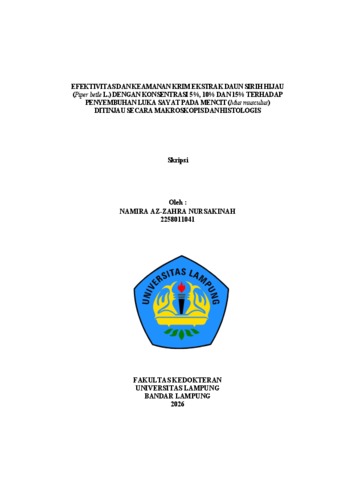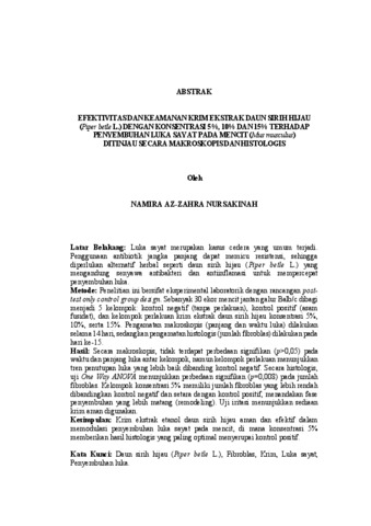 Namira , Az-Zahra Nursakinah (2026) Efektivitas dan Keamanan Krim Ekstrak Daun Sirih Hijau (Piper betle L.) dengan Konsentrasi 5%, 10% DAN 15% terhadap Luka Sayat pada Mencit (Mus musculus) ditinjau secara Makroskopis dan Histologis". FAKULTAS KEDOKTERAN, UNIVERSITAS LAMPUNG.