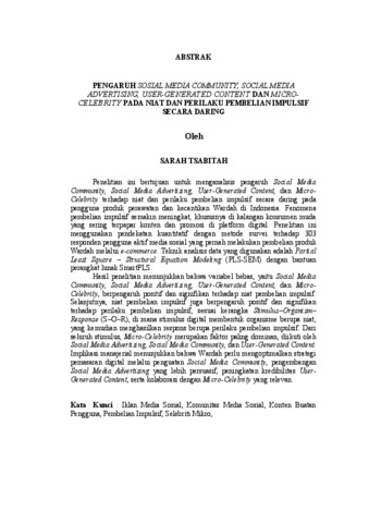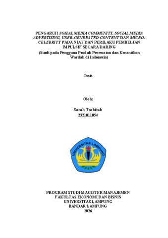 Sarah Tsabitah, (2026) PENGARUH SOSIAL MEDIA COMMUNITY, SOCIAL MEDIA ADVERTISING, USER-GENERATED CONTENT DAN MICRO-CELEBRITY PADA NIAT DAN PERILAKU PEMBELIAN IMPULSIF SECARA DARING (Studi pada Pengguna Produk Perawatan dan Kecantikan Wardah di Indonesia). Masters thesis, UNIVERSITAS LAMPUNG.