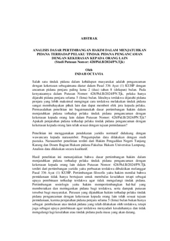 INDAH , OCTAVIA (2026) ANALISIS DASAR PERTIMBANGAN HAKIM DALAM MENJATUHKAN PIDANA TERHADAP PELAKU TINDAK PIDANA PENGANCAMAN DENGAN KEKERASAN KEPADA ORANG LAIN (Studi Putusan Nomor: 428/Pid.B/2024/PN.Tjk). FAKULTAS HUKUM, UNIVERSITAS LAMPUNG.