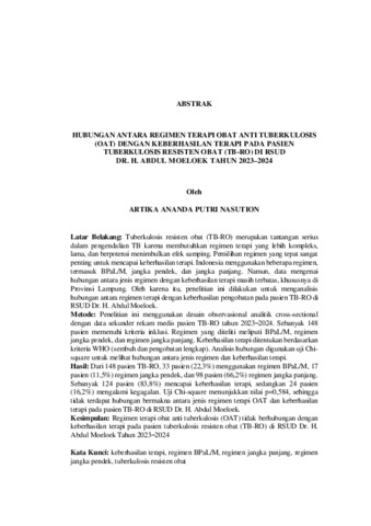 Artika Ananda Putri, Nasution (2025) HUBUNGAN ANTARA REGIMEN TERAPI OBAT ANTI TUBERKULOSIS (OAT) DENGAN KEBERHASILAN TERAPI PADA PASIEN TUBERKULOSIS RESISTEN OBAT (TB-RO) DI RSUD DR. H. ABDUL MOELOEK TAHUN 2023–2024. FAKULTAS KEDOKTERAN, UNIVERSITAS LAMPUNG.