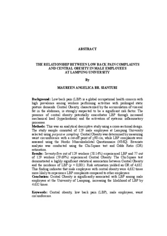 Maureen Angelica, Sianturi (2025) HUBUNGAN KELUHAN LOW BACK PAIN DENGAN OBESITAS SENTRAL PADA PEGAWAI PRIA DI LINGKUNGAN UNIVERSITAS LAMPUNG. FAKULTAS KEDOKTERAN, UNIVERSITAS LAMPUNG.