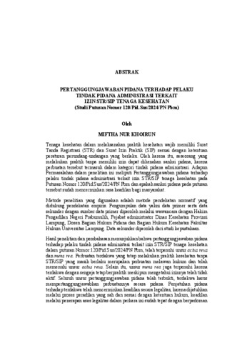 MIFTHA , NUR KHOIRUN (2026) PERTANGGUNGJAWABAN PIDANA TERHADAP PELAKU TINDAK PIDANA ADMINISTRASI TERKAIT IZIN STR/SIP TENAGA KESEHATAN (Studi Putusan Nomor 120/Pid.Sus/2024/PN Pbm). FAKULTAS HUKUM, UNIVERSITAS LAMPUNG.