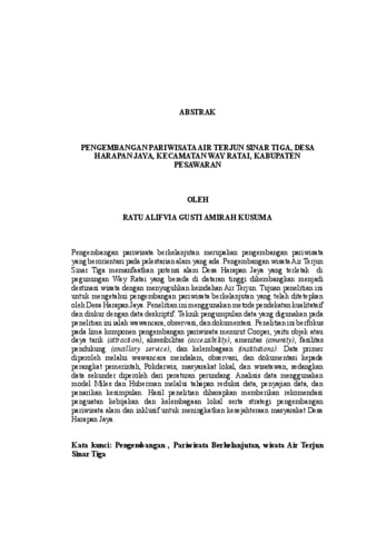 RATU , ALIFVIA GUSTI AMIRAH KUSUMA (2026) PENGEMBANGAN PARIWISATA AIR TERJUN SINAR TIGA, DESA HARAPAN JAYA, KECAMATAN WAY RATAI, KABUPATEN PESAWARAN. FAKULTAS ILMU SOSIAL DAN ILMU POLITIK, UNIVERSITAS LAMPUNG.