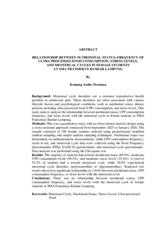 Komang Andre , Permana (2026) HUBUNGAN STATUS GIZI, FREKUENSI KONSUMSI ULTRA PROCESSED FOOD DAN TINGKAT STRES DENGAN SIKLUS MENSTRUASI PADA SISWI SMA FRANSISKUS BANDAR LAMPUNG. FAKULTAS KEDOKTERAN, UNIVERSITAS LAMPUNG.
