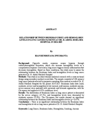 Background: Cigarette smoke exposure causes hypoxia through carboxyhemoglobin formation, which can increase hemoglobin levels as a compensatory response. Conversely, lung cancer triggers chronic inflammation that decreases hemoglobin. Based on these conditions, this study aims to assess the relationship between the Brinkman Index and hemoglobin levels in lung cancer patients at Dr. H. Abdul Moeloek Hospital. Methods: This study is an observational analytical research with a cross-sectional design using secondary medical record data. The sample consisted of 108 primary lung cancer patients selected by purposive sampling from medical records at Dr. H. Abdul Moeloek Hospital for the period 2024-2025. Brinkman Index data (mild, moderate, severe) and hemoglobin levels (normal, mild anemia, moderate anemia, severe anemia) were analyzed with univariate and bivariate approaches, with the Chi-square test applied at a 95% confidence level. Results: The distribution of Brinkman Index in lung cancer patient is dominated by the severe category (47.2%), and hemoglobin levels were dominated by moderate anemia (37.0%). The Chi-square test results showed no significant relationship between the Brinkman Index and hemoglobin levels (p = 0.674). Conclusions: : There is no significant relationship between the Brinkman Index and hemoglobin levels in lung cancer patients at Dr. H. Abdul Moeloek Hospital. Keywords: Lung Cancer, Brinkman Index, Hemoglobin, Smoking, Anemia Latar Belakang: Paparan asap rokok menyebabkan hipoksia melalui pembentukan karboksihemoglobin sehingga dapat meningkatkan kadar hemoglobin sebagai respon kompensasi. Disisi lain, kanker paru memicu inflamasi kronik yang menurunkan hemoglobin. Berdasarkan kondisi tersebut, penelitian ini bertujuan menilai hubungan antara Indeks Brinkman dan kadar hemoglobin pada pasien kanker paru di RSUD Dr. H. Abdul Moeloek. Metode: Penelitian analitik observasional dengan desain cross-sectional. Menggunakan data sekunder rekam medis. Sampel berjumlah 108 pasien kanker paru primer yang dipilih secara purposive sampling dari rekam medis RSUD Dr. H. Abdul Moeloek tahun 2024-2025. Data Indeks Brinkman (ringan,sedang, berat) dan kadar hemoglobin (normal, anemia ringan, sedang, berat) dianalisis secara univariat dan bivariat menggunakan uji Chi-square dengan tingkat kepercayaan 95%. Hasil: Distribusi Indeks Brinkman pada pasien kanker paru didominasi kategori berat (47,2%) dan hemoglobin didominasi anemia sedang (37,0%). Hasil uji Chisquare menunjukkan tidak terdapat hubungan yang signifikan antara Indeks Brinkman dan kadar hemoglobin (p = 0,674). Kesimpulan: Tidak terdapat hubungan bermakna antara Indeks Brinkman dan kadar hemoglobin pada pasien kanker paru di RSUD Dr. H. Abdul Moeloek. Kata Kunci: Kanker Paru, Indeks Brinkman, Hemoglobin, Merokok, Anemia