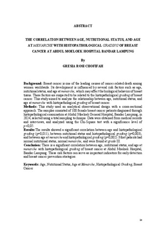 Gresia Rosi, Chofifah (2025) HUBUNGAN FAKTOR RISIKO USIA, STATUS GIZI, DAN USIA MENARCHE DENGAN GRADING HISTOPATOLOGI KANKER PAYUDARA DI RUMAH SAKIT ABDUL MOELOEK BANDAR LAMPUNG. FAKULTAS KEDOKTERAN, UNIVERSITAS LAMPUNG.