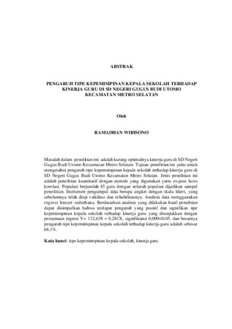 PENGARUH TIPE KEPEMIMPINAN KEPALA SEKOLAH TERHADAP KINERJA GURU DI SD NEGERI GUGUS BUDI UTOMO KECAMATAN METRO SELATAN