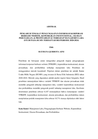 Penelitian ini bertujuan untuk mengetahui pengaruh tingkat pengungkapan informasi korporasi berbasis website (TPIKBW), kepemilikan institusional, ukuran perusahaan, dan profitabilitas terhadap manajemen laba Penelitian ini menggunakan metode kuantitatif. Populasi dalam penelitian ini adalah Badan Usaha Milik Negara (BUMN) yang tercatat di Bursa Efek Indonesia (BEI) tahun 2020-2024. Metode yang digunakan adalah analisi regresi linear berganda. Hasil penelitian menunjukkan bahwa variabel TPIKBW dan ukuran perusahaan tidak memiliki pengaruh terhadap manajemen laba, variabel kepemilikan institusional dan profitabilitas memiliki pengaruh positif terhadap manajemen laba. Koefisien determinasi penelitian sebesar 0,107 menunjukkan bahwa kemampuan variabel TPIKBW, kepemilikan institusional, ukuran perusahaan, dan profitabilitas dalam menjelaskan praktik manajemen laba sebesar 10,7% sisanya dijelaskan oleh faktor lain.