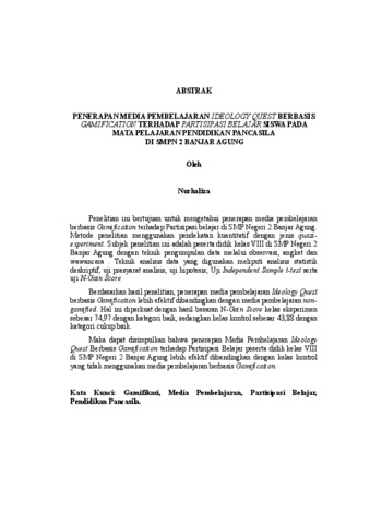 Penelitian ini bertujuan untuk mengetahui penerapan media pembelajaran berbasis Gamification terhadap Partisipasi belajar di SMP Negeri 2 Banjar Agung. Metode penelitian menggunakan pendekatan kuantitatif dengan jenis quasiexperiment. Subjek penelitian ini adalah peserta didik kelas VIII di SMP Negeri 2 Banjar Agung dengan teknik pengumpulan data melalui observasi, angket dan wawancara . Teknik analisis data yang digunakan meliputi analisis statistik deskriptif, uji prasyarat analisis, uji hipotesis, Uji Independent Sample t-test serta uji N-Gain Score Berdasarkan hasil penelitian, penerapan media pembelajaran Ideology Quest berbasis Gamification lebih efektif dibandingkan dengan media pembelajaran nongamified. Hal ini diperkuat dengan hasil besaran N-Gain Score kelas eksperimen sebesar 74,97 dengan kategori baik, sedangkan kelas kontrol sebesar 43,88 dengan kategori cukup baik. Maka dapat disimpulkan bahwa penerapan Media Pembelajaran Ideology Quest Berbasis Gamification terhadap Partisipasi Belajar peserta didik kelas VIII di SMP Negeri 2 Banjar Agung lebih efektif dibandingkan dengan kelas kontrol yang tidak menggunakan media pembelajaran berbasis Gamification. Kata Kunci: Gamifikasi, Media Pembelajaran, Partisipasi Belajar, Pendidikan Pancasila.