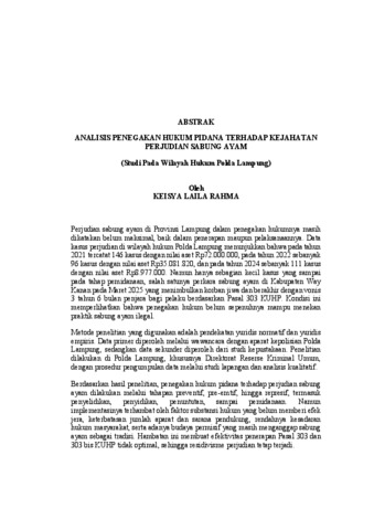 KEISYA , LAILA RAHMA (2026) ANALISIS PENEGAKAN HUKUM PIDANA TERHADAP KEJAHATAN PERJUDIAN SABUNG AYAM (Studi Pada Wilayah Hukum Polda Lampung). FAKULTAS HUKUM , UNIVERSITAS LAMPUNG.