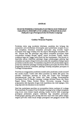 CYNDITYA, NOVIYANTY PANJAITAN (2026) URGENSI PEMBERIAN REHABILITASI PSIKOLOGIS TERHADAP NARAPIDANA PEREMPUAN DI LEMBAGA PEMASYARAKATAN (Studi pada Lapas Perempuan Kelas IIA Bandar Lampung). FAKULTAS HUKUM, UNIVERSITAS LAMPUNG.