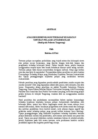 SHABINA , AL FITRI (2026) ANALISIS KRIMINOLOGIS TERHADAP KEJAHATAN TAWURAN PELAJAR ANTARSEKOLAH (Studi pada Polresta Tangerang). FAKULTAS HUKUM, UNIVERSITAS LAMPUNG.