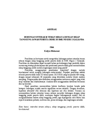 KALYYA , MAHARANI (2026) HUBUNGAN INTERAKSI TEMAN SEBAYA DENGAN SIKAP TANGGUNG JAWAB PESERTA DIDIK DI SMK NEGERI 2 KALIANDA. FAKULTAS KEGURUAN DAN ILMU PENDIDIKAN, UNIVERSITAS LAMPUNG.