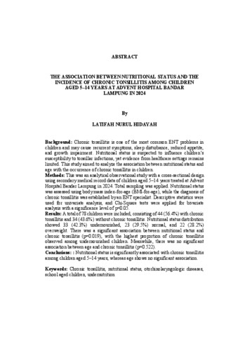Latifah Nurul, Hidayah (2026) HUBUNGAN STATUS GIZI DENGAN KEJADIAN TONSILITIS KRONIK PADA PASIEN ANAK USIA 5 – 14 TAHUN DI RS ADVENT BANDAR LAMPUNG TAHUN 2024. FAKULTAS KEDOKTERAN, UNIVERSITAS LAMPUNG.