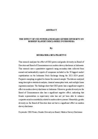This research analyzes the effect of CEO power and gender diversity on Board of Directors and Board of Commissioners on modern slavery disclosure in Indonesia. This research uses a quantitative approach using secondary data collected from annual and sustainability reports of companies included in the 50 biggest market capitalization on the Indonesia Stock Exchange during the 2022–2024 period. Purposive sampling is applied to choose the research sample. The data are analyzed using descriptive statistical analysis, classical assumption tests, and multiple linear regression analysis. The findings show that CEO power has a significant negative effect on modern slavery disclosure in Indonesia. Moreover, gender diversity on the Board of Commissioners also has a significant negative effect, indicating that female representation in supervisory roles has not yet been able to enhance corporate social accountability related to modern slavery issues. Meanwhile, gender diversity on the Board of Directors does not have a significant effect on modern slavery disclosure. Keywords: CEO Power, Gender Diversity on Board, Modern Slavery Disclosure