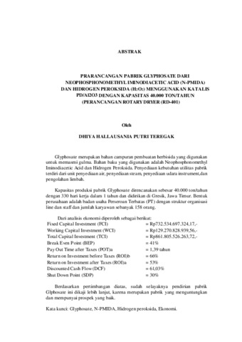 PRARANCANGAN PABRIK GLYPHOSATE DARI NEOPHOSPHONOMETHYL IMINODIACETIC ACID (N-PMIDA) DAN HYDROGEN PEROXIDE (H2O2) MENGGUNAKAN KATALIS Pd/Al2O3 DENGAN KAPASITAS 40.000 TON/TAHUN