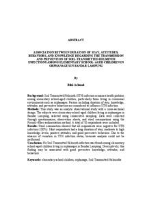 - HUBUNGAN DURASI TINGGAL, SIKAP, PERILAKU, SERTA PENGETAHUAN TENTANG PENULARAN DAN PENCEGAHAN TERHADAP INFEKSI SOIL TRANSMITTED HELMINTHS PADA ANAK USIA SEKOLAH DASAR DI PANTI ASUHAN WILAYAH BANDAR LAMPUNG. (deposited 09 Feb 2026 03:37) [Currently Displayed]
