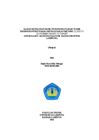 Digdo Bayu, Riky Subagja (2026) KAJIAN KETELITIAN HASIL PENGUKURAN LIDAR TLS100 PRODUKSI POTRETUDARA MENGGUNAKAN METODE CLOUD TO CLOUD DAN TARGET TO TARGET (STUDI KASUS : BANGUNAN KANTOR BAZNAS PROVINSI LAMPUNG). FAKULTAS TEKNIK, UNIVERSITAS LAMPUNG.