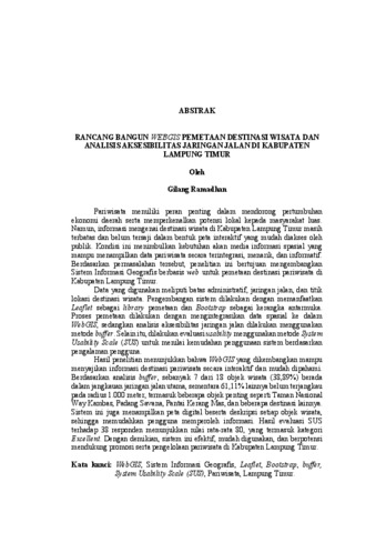 Pariwisata memiliki peran penting dalam mendorong pertumbuhan ekonomi daerah serta memperkenalkan potensi lokal kepada masyarakat luas. Namun, informasi mengenai destinasi wisata di Kabupaten Lampung Timur masih terbatas dan belum tersaji dalam bentuk peta interaktif yang mudah diakses oleh publik. Kondisi ini menimbulkan kebutuhan akan media informasi spasial yang mampu menampilkan data pariwisata secara terintegrasi, menarik, dan informatif. Berdasarkan permasalahan tersebut, penelitian ini bertujuan mengembangkan Sistem Informasi Geografis berbasis web untuk pemetaan destinasi pariwisata di Kabupaten Lampung Timur. Data yang digunakan meliputi batas administratif, jaringan jalan, dan titik lokasi destinasi wisata. Pengembangan sistem dilakukan dengan memanfaatkan Leaflet sebagai library pemetaan dan Bootstrap sebagai kerangka antarmuka. Proses pemetaan dilakukan dengan mengintegrasikan data spasial ke dalam WebGIS, sedangkan analisis aksesibilitas jaringan jalan dilakukan menggunakan metode buffer. Selain itu, dilakukan evaluasi usability menggunakan metode System Usability Scale (SUS) untuk menilai kemudahan penggunaan sistem berdasarkan pengalaman pengguna. Hasil penelitian menunjukkan bahwa WebGIS yang dikembangkan mampu menyajikan informasi destinasi pariwisata secara interaktif dan mudah dipahami. Berdasarkan analisis buffer, sebanyak 7 dari 18 objek wisata (38,89%) berada dalam jangkauan jaringan jalan utama, sementara 61,11% lainnya belum terjangkau pada radius 1.000 meter, termasuk beberapa objek penting seperti Taman Nasional Way Kambas, Padang Savana, Pantai Kerang Mas, dan beberapa destinasi lainnya. Sistem ini juga menampilkan peta digital beserta deskripsi setiap objek wisata, sehingga memudahkan pengguna memperoleh informasi. Hasil evaluasi SUS terhadap 38 responden menunjukkan nilai rata-rata 80, yang termasuk kategori Excellent. Dengan demikian, sistem ini efektif, mudah digunakan, dan berpotensi mendukung promosi serta pengelolaan pariwisata di Kabupaten Lampung Timur. Kata kunci: WebGIS, Sistem Informasi Geografis, Leaflet, Bootstrap, buffer, System Usability Scale (SUS), Pariwisata, Lampung Timur. Tourism plays an important role in driving regional economic growth and promoting local potential to a wider audience. However, information regarding tourist destinations in East Lampung Regency is still limited and has not yet been presented in an easily accessible interactive map. This condition creates a need for a spatial information medium capable of presenting tourism data in an integrated, attractive, and informative manner. Based on these issues, this research aims to develop a web-based Geographic Information System for mapping tourist destinations in East Lampung Regency. The data used in this study include administrative boundaries, road networks, and point locations of tourist destinations. The system was developed using Leaflet as the mapping library and Bootstrap as the interface framework. The mapping process was carried out by integrating spatial data into the WebGIS, while the accessibility analysis of the road network was conducted using the buffer method. In addition, a usability evaluation using the System Usability Scale (SUS) method was performed to assess the system’s ease of use based on user experience. The results show that the developed WebGIS is capable of presenting tourist destination information interactively and comprehensively. Based on the buffer analysis, 7 of the 18 tourist destinations (38.89%) are within the reach of the main road network, while the remaining 61.11% are not accessible within a 1,000-meter radius, including several key destinations such as Way Kambas National Park, Padang Savanna, Kerang Mas Beach, and several others. The system also displays digital maps along with descriptions of each tourist destination, making it easier for users to obtain information. The SUS evaluation involving 38 respondents produced an average score of 80, which falls under the “Excellent” category. Therefore, this system is effective, easy to use, and has the potential to support tourism promotion and management in East Lampung Regency. Keywords: WebGIS, Geographic Information System, Leaflet, Bootstrap, buffer, System Usability Scale (SUS), Tourism, East Lampung.