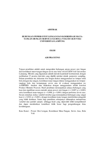 ADI , PRAYITNO (2025) HUBUNGAN POWER OTOT LENGAN DAN KOORDINASI MATATANGAN DENGAN SERVIS ATAS BOLA VOLI DI UKM VOLI UNIVERSITAS LAMPUNG. FAKULTAS KEGURUAN DAN ILMU PENDIDIKAN, UNIVERSITAS LAMPUNG.
