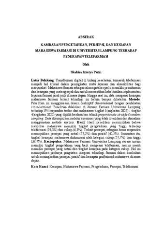 SHAKIRA, IZZATYA PUTRI (2026) GAMBARAN PENGETAHUAN, PERSEPSI, DAN KESIAPAN MAHASISWA FARMASI DI UNIVERSITAS LAMPUNG TERHADAP PENERAPAN TELEFARMASI. FAKULTAS KEDOKTERAN, UNIVERSITAS LAMPUNG.