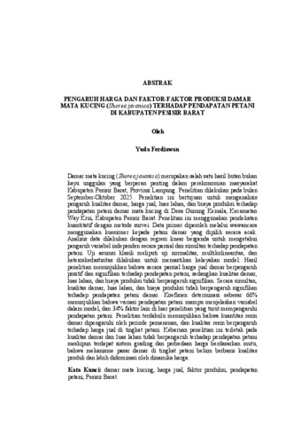 Yuda , Ferdiawan (2026) PENGARUH HARGA DAN FAKTOR-FAKTOR PRODUKSI DAMAR MATA KUCING (Shorea javanica) TERHADAP PENDAPATAN PETANI DI KABUPATEN PESISIR BARAT. FAKULTAS PERTANIAN, UNIVERSITAS LAMPUNG.