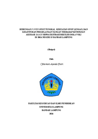 Oktaviani, Ananda Putri (2026) HUBUNGAN POWER OTOT TUNGKAI, KEKUATAN OTOT LENGAN, DAN KELENTURAN PERGELANGAN TANGAN TERHADAP KETEPATAN AKURASI SMASH SISWA EKSTRAKURIKULER BOLA VOLI DI SMA NEGERI 15 BANDAR LAMPUNG. FAKULTAS KEGURUAN DAN ILMU PENDIDIKAN, UNIVERSITAS LAMPUNG.