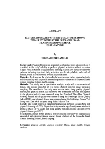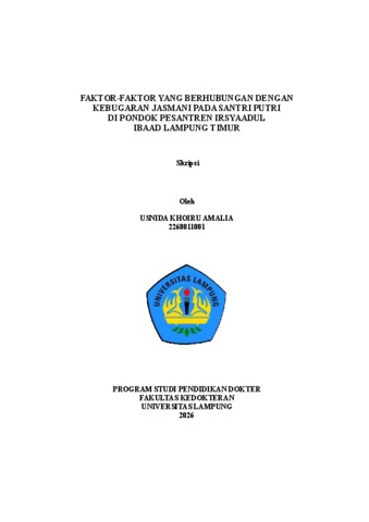 Usnida, Khoiru Amalia (2026) FAKTOR-FAKTOR YANG BERHUBUNGAN DENGAN KEBUGARAN JASMANI PADA SANTRI PUTRI DI PONDOK PESANTREN IRSYAADUL IBAAD LAMPUNG TIMUR. FAKULTAS KEDOKTERAN, UNIVERSITAS LAMPUNG.