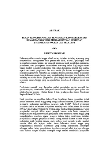 RENDY , ARIANSYAH (2026) PERAN KEPOLISIAN DALAM PENYIDIKAN KASUS KEKERASAN RUMAH TANGGA YANG MENGAKIBATKAN KEMATIAN (STUDI KASUS POLRES OKU SELATAN). FAKULTAS HUKUM, UNIVERSITAS LAMPUNG.