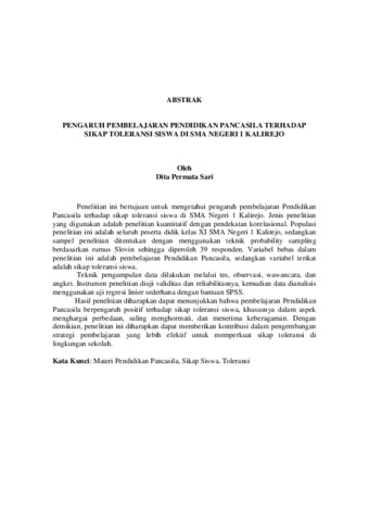 Penelitian ini bertujuan untuk mengetahui pengaruh pembelajaran Pendidikan Pancasila terhadap sikap toleransi siswa di SMA Negeri 1 Kalirejo. Jenis penelitian yang digunakan adalah penelitian kuantitatif dengan pendekatan korelasional. Populasi penelitian ini adalah seluruh peserta didik kelas XI SMA Negeri 1 Kalirejo, sedangkan sampel penelitian ditentukan dengan menggunakan teknik probability sampling berdasarkan rumus Slovin sehingga diperoleh 39 responden. Variabel bebas dalam penelitian ini adalah pembelajaran Pendidikan Pancasila, sedangkan variabel terikat adalah sikap toleransi siswa. Teknik pengumpulan data dilakukan melalui tes, observasi, wawancara, dan angket. Instrumen penelitian diuji validitas dan reliabilitasnya, kemudian data dianalisis menggunakan uji regresi linier sederhana dengan bantuan SPSS. Hasil penelitian diharapkan dapat menunjukkan bahwa pembelajaran Pendidikan Pancasila berpengaruh positif terhadap sikap toleransi siswa, khususnya dalam aspek menghargai perbedaan, saling menghormati, dan menerima keberagaman. Dengan demikian, penelitian ini diharapkan dapat memberikan kontribusi dalam pengembangan strategi pembelajaran yang lebih efektif untuk memperkuat sikap toleransi di lingkungan sekolah. Kata Kunci: Materi Pendidikan Pancasila, Sikap Siswa, Toleransi