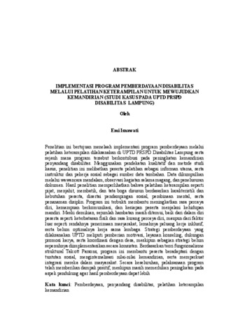 Penelitian ini bertujuan menelaah implementasi program pemberdayaan melalui pelatihan keterampilan dilaksanakan di UPTD PRSPD Disabilitas Lampung serta sejauh mana program tersebut berkontribusi pada peningkatan kemandirian penyandang disabilitas. Menggunakan pendekatan kualitatif dan metode studi kasus, penelitian ini melibatkan peserta pelatihan sebagai informan utama, serta instruktur dan pekerja sosial sebagai sumber data tambahan. Data dikumpulkan melalui wawancara mendalam, observasi kegiatan selama magang, dan penelusuran dokumen. Hasil penelitian memperlihatkan bahwa pelatihan keterampilan seperti pijat, menjahit, membatik, dan tata boga disusun berdasarkan karakteristik dan kebutuhan peserta, disertai pendampingan sosial, pembinaan mental, serta penanaman disiplin. Program ini terbukti membantu meningkatkan rasa percaya diri, kemampuan berkomunikasi, dan kesiapan peserta menjalani kehidupan mandiri. Meski demikian, sejumlah hambatan masih ditemui, baik dari dalam diri peserta seperti keterbatasan fisik dan rasa kurang percaya diri, maupun dari faktor luar seperti rendahnya penerimaan masyarakat, lemahnya peluang kerja inklusif, serta belum optimalnya kerja sama lembaga. Strategi pemberdayaan yang dilaksanakan UPTD meliputi pemberian motivasi, layanan konseling, dukungan promosi karya, serta koordinasi dengan desa, meskipun sebagian strategi belum sepenuhnya diimplementasikan secara konsisten. Berdasarkan teori fungsionalisme struktural Talcott Parsons, program ini membantu peserta beradaptasi dengan tuntutan sosial, menginternalisasi nilai-nilai kemandirian, serta memperkuat integrasi mereka dalam masyarakat. Secara keseluruhan, pelaksanaan program telah memberikan dampak positif, meskipun masih memerlukan peningkatan pada aspek pendukung agar hasil pemberdayaan dapat lebih Kata kunci: Pemberdayaan, penyandang disabilitas, pelatihan keterampilan kemandirian This study aims to examine implementation empowerment program through skills training is implemented at UPTD PRSPD Disabilitas Lampung and to what extent the program contributes to enhancing the independence of persons with disabilities. Using a qualitative approach and a case study method, this research involved training participants as the main informants, while instructors and social workers served as supporting data sources. Data were collected through in-depth interviews, observations conducted during field practice, and document analysis. The findings indicate that skills training such as massage, sewing, batik-making, and culinary skills is designed based on the characteristics and needs of the participants and is accompanied by social assistance, mental guidance, and the cultivation of discipline. The program has been shown to improve participants’ self-confidence, communication abilities, and readiness for independent living. However, several obstacles remain, both internal such as physical limitations and low self-confidence and external, including limited community acceptance, insufficient inclusive employment opportunities, and the suboptimal collaboration between institutions. The empowerment strategies applied by UPTD include motivation, counseling services, support for promoting participants’ work, and coordination with village authorities, although some of these strategies have not yet been implemented consistently. Based on Talcott Parsons’ structural functionalism theory, the program supports participants in adapting to social demands, internalizing values of independence, and strengthening their social integration. Overall, the implementation of this program has shown positive impacts, although improvements in supporting aspects are still needed to maximize empowerment outcomes. Keywords: empowerment, persons with disabilities, skills training, independence