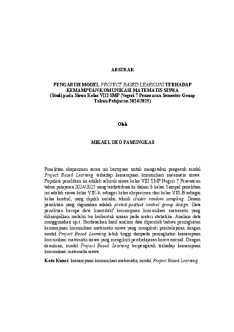 MIKAEL DEO , PAMUNGKAS (2025) PENGARUH MODEL PROJECT BASED LEARNING TERHADAP KEMAMPUAN KOMUNIKASI MATEMATIS SISWA (Studi pada Siswa Kelas VIII SMP Negeri 7 Pesawaran Semester Genap Tahun Pelajaran 2024/2025). FAKULTAS KEGURUAN DAN ILMU PENDIDIKAN, UNIVERSITAS LAMPUNG.