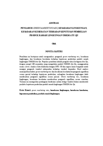 NOVITA, SAFITRI (2026) PENGARUH GREEN MARKETING MIX, KESADARAN LINGKUNGAN, KESADARAN KESEHATAN TERHADAP KEPUTUSAN PEMBELIAN PRODUK RAMAH LINGKUNGAN UMKM ATU QU. FAKULTAS ILMU SOSIAL DAN ILMU POLITIK , UNIVERSITAS LAMPUNG.