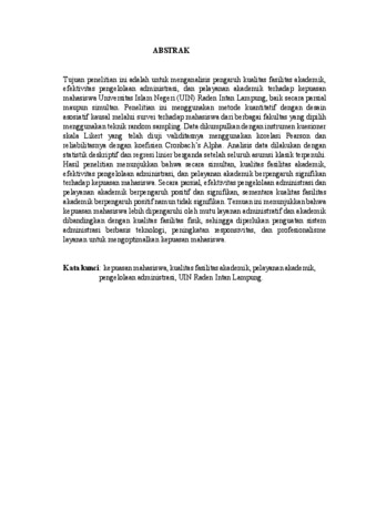 Tujuan penelitian ini adalah untuk menganalisis pengaruh kualitas fasilitas akademik, efektivitas pengelolaan administrasi, dan pelayanan akademik terhadap kepuasan mahasiswa Universitas Islam Negeri (UIN) Raden Intan Lampung, baik secara parsial maupun simultan. Penelitian ini menggunakan metode kuantitatif dengan desain asosiatif kausal melalui survei terhadap mahasiswa dari berbagai fakultas yang dipilih menggunakan teknik random sampling. Data dikumpulkan dengan instrumen kuesioner skala Likert yang telah diuji validitasnya menggunakan korelasi Pearson dan reliabilitasnya dengan koefisien Cronbach’s Alpha. Analisis data dilakukan dengan statistik deskriptif dan regresi linier berganda setelah seluruh asumsi klasik terpenuhi. Hasil penelitian menunjukkan bahwa secara simultan, kualitas fasilitas akademik, efektivitas pengelolaan administrasi, dan pelayanan akademik berpengaruh signifikan terhadap kepuasan mahasiswa. Secara parsial, efektivitas pengelolaan administrasi dan pelayanan akademik berpengaruh positif dan signifikan, sementara kualitas fasilitas akademik berpengaruh positif namun tidak signifikan. Temuan ini menunjukkan bahwa kepuasan mahasiswa lebih dipengaruhi oleh mutu layanan administratif dan akademik dibandingkan dengan kualitas fasilitas fisik, sehingga diperlukan penguatan sistem administrasi berbasis teknologi, peningkatan responsivitas, dan profesionalisme layanan untuk mengoptimalkan kepuasan mahasiswa. Kata kunci: kepuasan mahasiswa, kualitas fasilitas akademik, pelayanan akademik, pengelolaan administrasi, UIN Raden Intan Lampung.