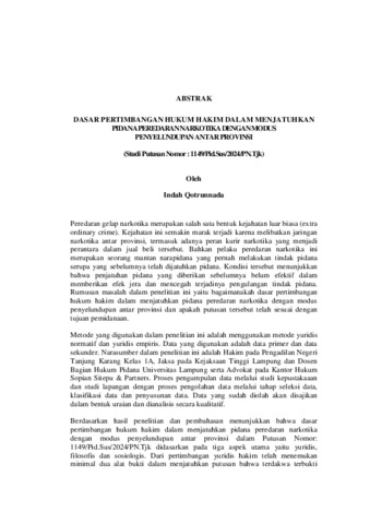 INDAH , QOTRUNNADA (2026) DASAR PERTIMBANGAN HUKUM HAKIM DALAM MENJATUHKAN PIDANA PEREDARAN NARKOTIKA DENGAN MODUS PENYELUNDUPAN ANTAR PROVINSI (Studi Putusan No: 1149/Pid.Sus/2024/PN Tjk). FAKULTAS HUKUM, UNIVERSITAS LAMPUNG.